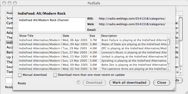 2005.06.30 - Now that iTunes 4.9 has podcasting support, I really do not see a need to continue development on this. So, version 0.4 is the final one. It was a fun little project. Enjoy it!